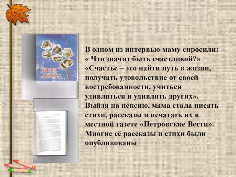 «Счастье – это найти путь в жизни, получать удовольствие от своей востребованности, учиться удивляться и удивлять других». Выйдя на пенсию, мама стала писать стихи, рассказы и печатать их в местной газете «Петровские Вести». Многие её рассказы и стихи были опубликованы