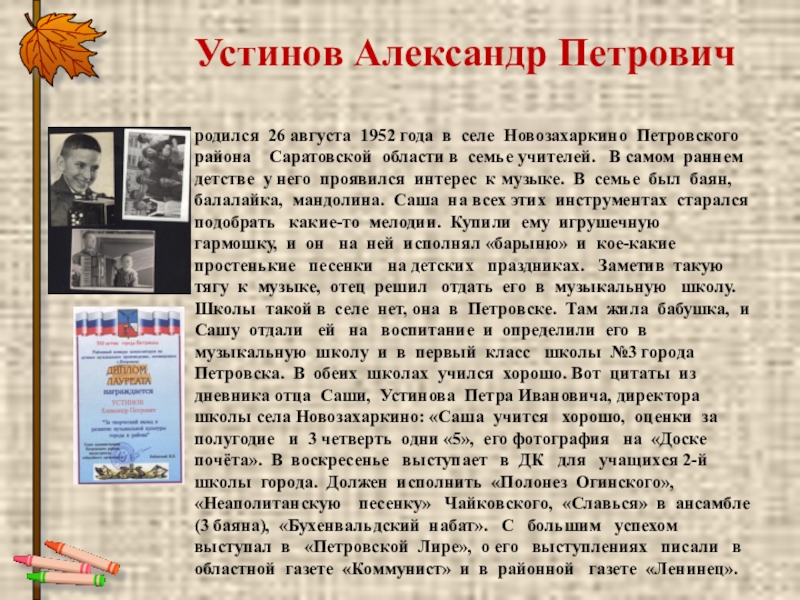 района Саратовской области в семье учителей. В самом раннем детстве у него проявился интерес к музыке. В семье был баян, балалайка, мандолина. Саша на всех этих инструментах старался подобрать какие-то мелодии. Купили ему игрушечную гармошку, и он на ней исполнял «барыню» и кое-какие простенькие песенки на детских праздниках. Заметив такую тягу к музыке, отец решил отдать его в музыкальную школу. Школы такой в селе нет, она в Петровске. Там жила бабушка, и Сашу отдали ей на воспитание и определили его в музыкальную школу и в первый класс школы №3 города Петровска. В обеих школах учился хорошо. Вот цитаты из дневника отца Саши, Устинова Петра Ивановича, директора школы села Новозахаркино: «Саша учится хорошо, оценки за полугодие и 3 четверть одни «5», его фотография на «Доске почёта». В воскресенье выступает в ДК для учащихся 2-й школы города. Должен исполнить «Полонез Огинского», «Неаполитанскую песенку» Чайковского, «Славься» в ансамбле (3 баяна), «Бухенвальдский набат». С большим успехом выступал в «Петровской Лире», о его выступлениях писали в областной газете «Коммунист» и в районной газете «Ленинец».