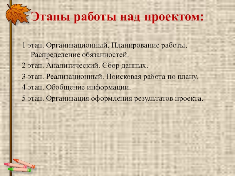 1 этап. Организационный. Планирование работы. Распределение обязанностей.