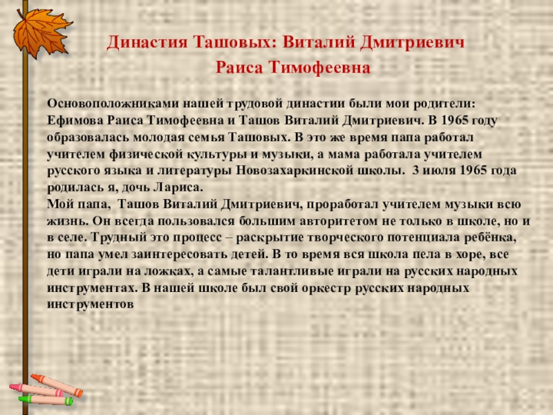 Мой папа, Ташов Виталий Дмитриевич, проработал учителем музыки всю жизнь. Он всегда пользовался большим авторитетом не только в школе, но и в селе. Трудный это процесс – раскрытие творческого потенциала ребёнка, но папа умел заинтересовать детей. В то время вся школа пела в хоре, все дети играли на ложках, а самые талантливые играли на русских народных инструментах. В нашей школе был свой оркестр русских народных инструментов