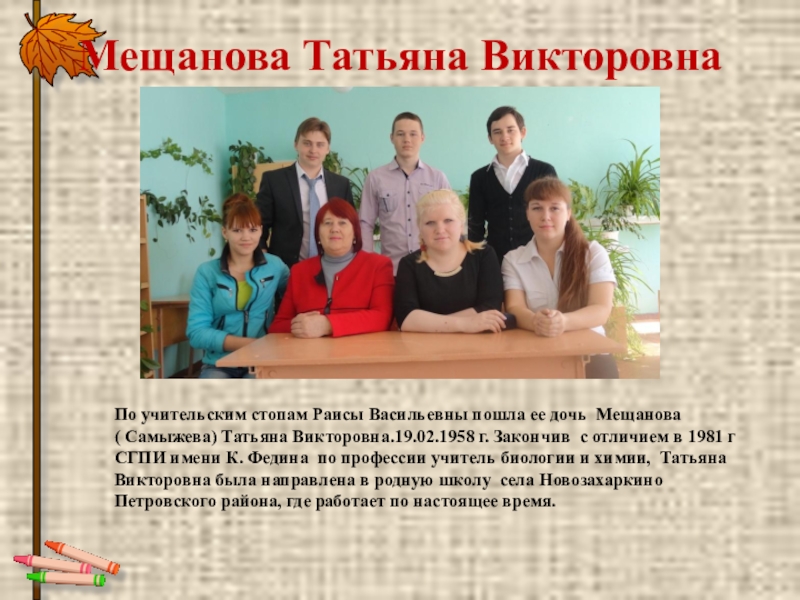 ( Самыжева) Татьяна Викторовна.19.02.1958 г. Закончив с отличием в 1981 г СГПИ имени К. Федина по профессии учитель биологии и химии, Татьяна Викторовна была направлена в родную школу села Новозахаркино Петровского района, где работает по настоящее время.
