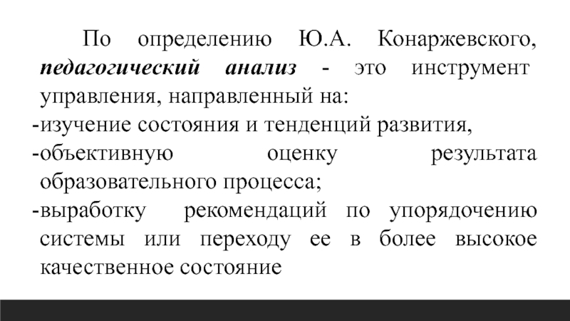 Слайд 6 По определению Ю.А. Конаржевского, педагогический анализ - это инструмент управления, направленный