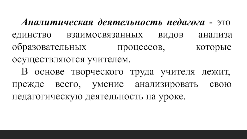 Слайд 7 Аналитическая деятельность педагога - это единство взаимосвязанных видов анализа образовательных процессов,