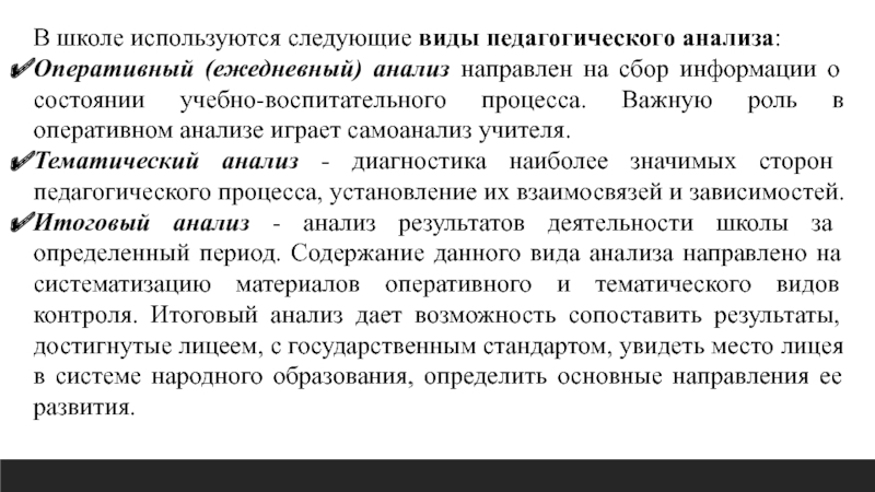Слайд 10В школе используются следующие виды педагогического анализа: