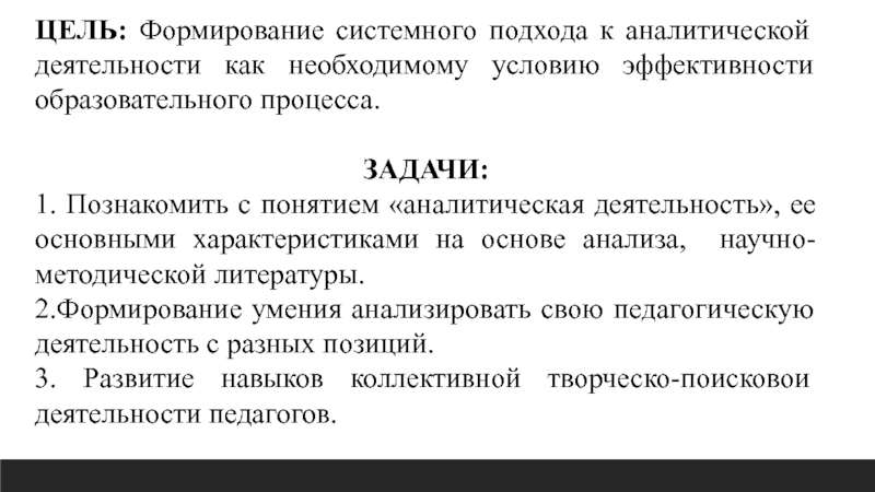 Слайд 3ЦЕЛЬ: Формирование системного подхода к аналитической деятельности как необходимому условию эффективности