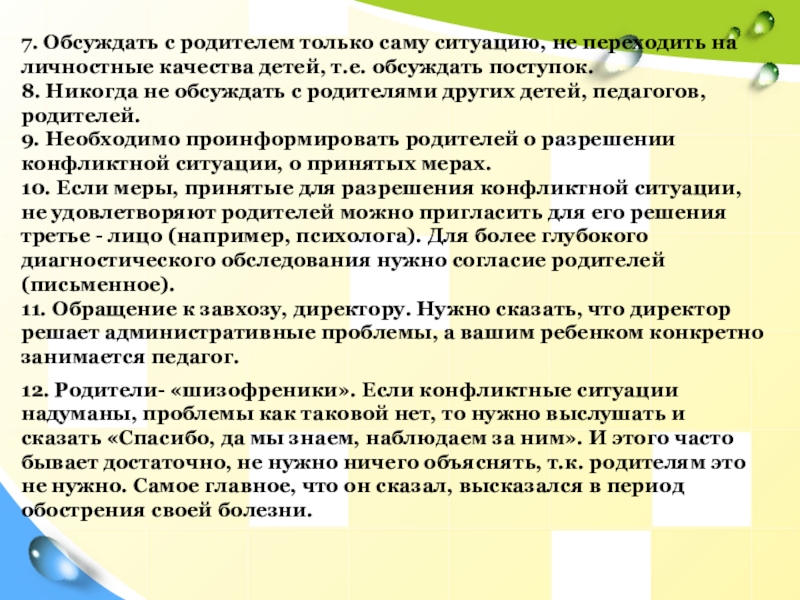 12. Родители- «шизофреники». Если конфликтные ситуации надуманы, проблемы как таковой нет, то нужно выслушать и сказать «Спасибо, да мы знаем, наблюдаем за ним». И этого часто бывает достаточно, не нужно ничего объяснять, т.к. родителям это не нужно. Самое главное, что он сказал, высказался в период обострения своей болезни.