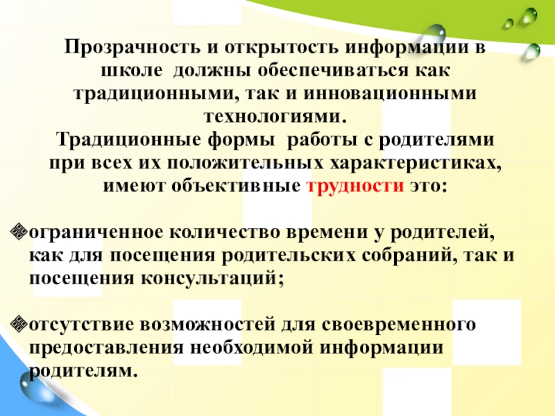 ограниченное количество времени у родителей, как для посещения родительских собраний, так и посещения консультаций;