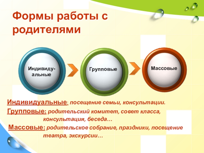 Массовые: родительское собрание, праздники, посещение театра, экскурсии…