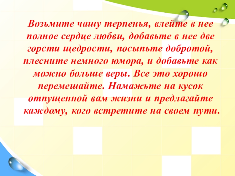 Слайд 42Возьмите чашу терпенья, влейте в нее полное сердце любви, добавьте в