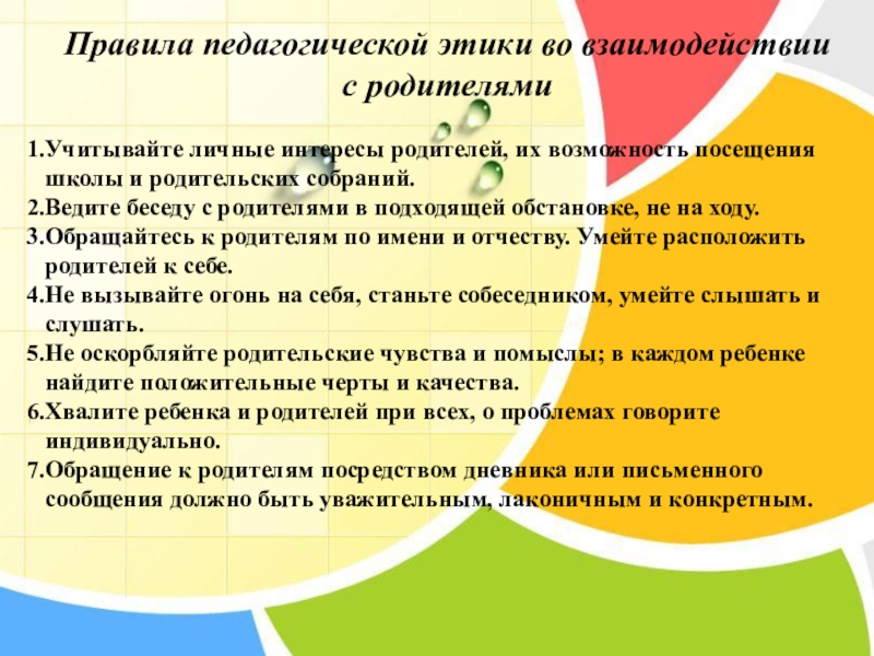 Обращайтесь к родителям по имени и отчеству. Умейте расположить родителей к себе.