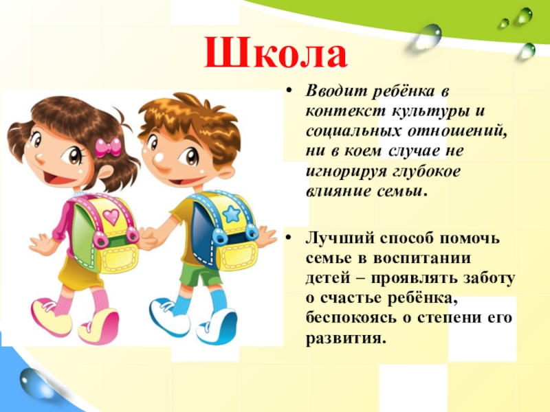 Вводит ребёнка в контекст культуры и социальных отношений, ни в коем