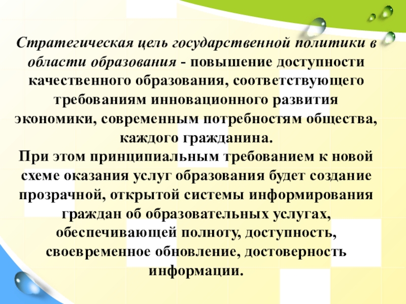 Слайд 26Стратегическая цель государственной политики в области образования - повышение доступности качественного