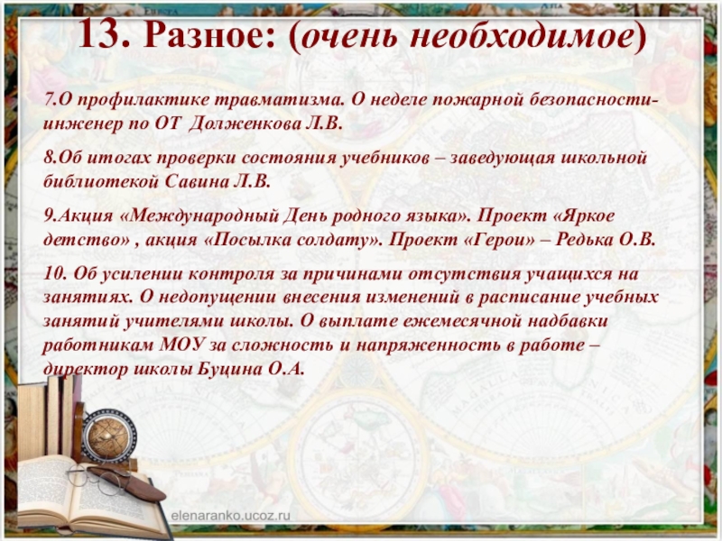 10. Об усилении контроля за причинами отсутствия учащихся на занятиях. О недопущении внесения изменений в расписание учебных занятий учителями школы. О выплате ежемесячной надбавки работникам МОУ за сложность и напряженность в работе – директор школы Буцина О.А.