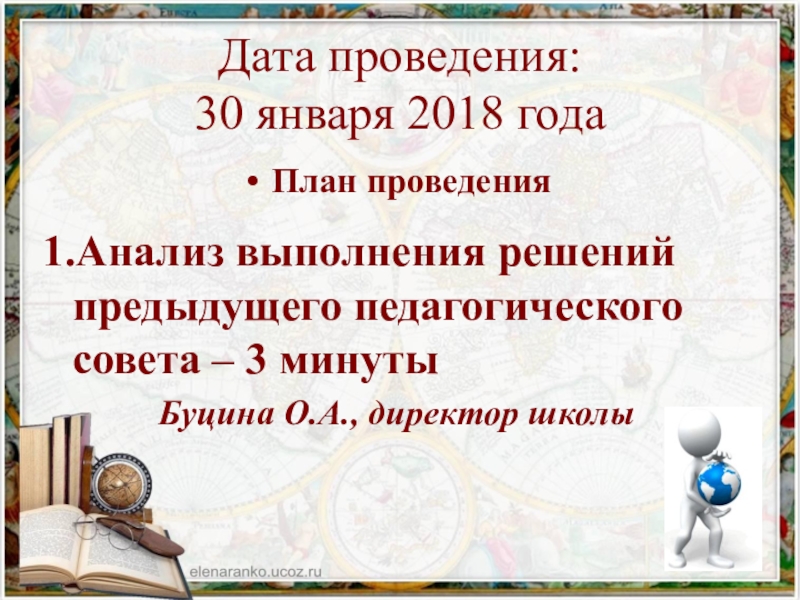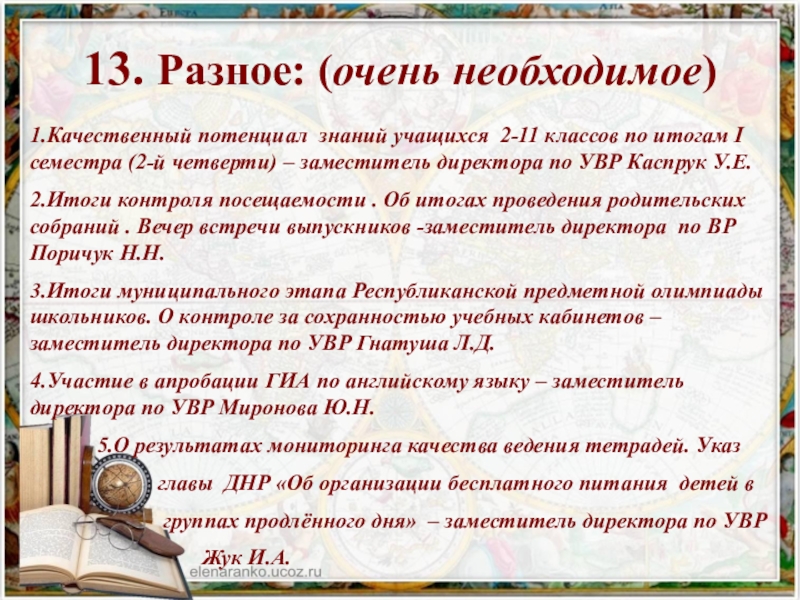 2.Итоги контроля посещаемости . Об итогах проведения родительских собраний . Вечер встречи выпускников -заместитель директора по ВР Поричук Н.Н.