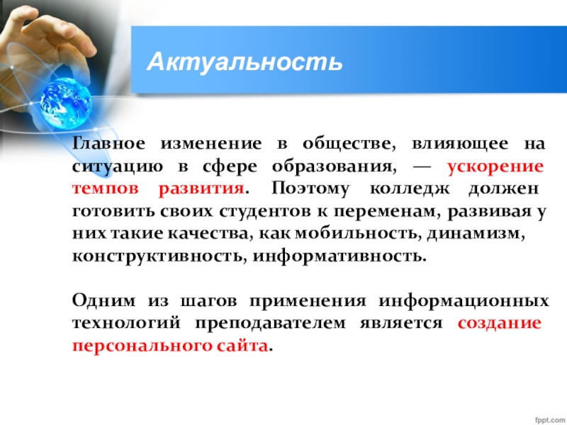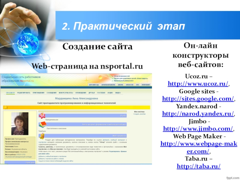 Это сайт презентаций, где можно хранить и обмениваться своими презентациями, докладами, проектами, шаблонами в формате PowerPoint с другими пользователями. Мы помогаем школьникам, студентам, учителям, преподавателям хранить и обмениваться учебными материалами.