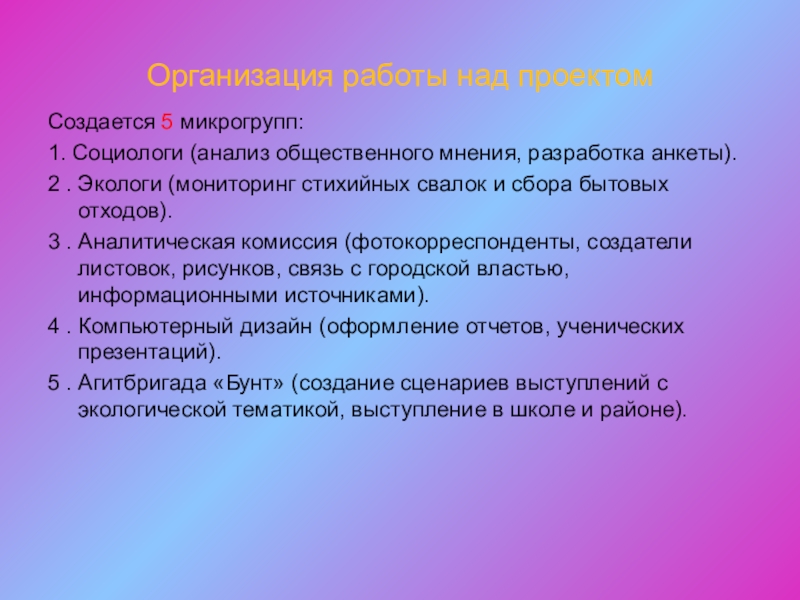 5 . Агитбригада «Бунт» (создание сценариев выступлений с экологической тематикой, выступление в школе и районе).