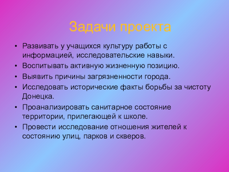 Исследовать исторические факты борьбы за чистоту Донецка.