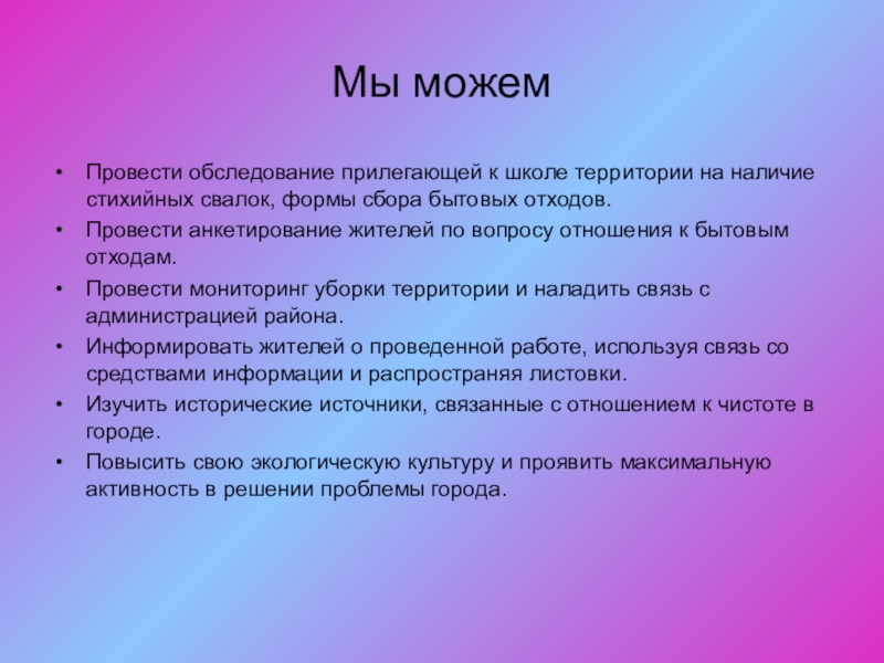 Повысить свою экологическую культуру и проявить максимальную активность в решении проблемы города.