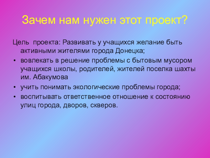 вовлекать в решение проблемы с бытовым мусором учащихся школы, родителей, жителей поселка шахты им. Абакумова