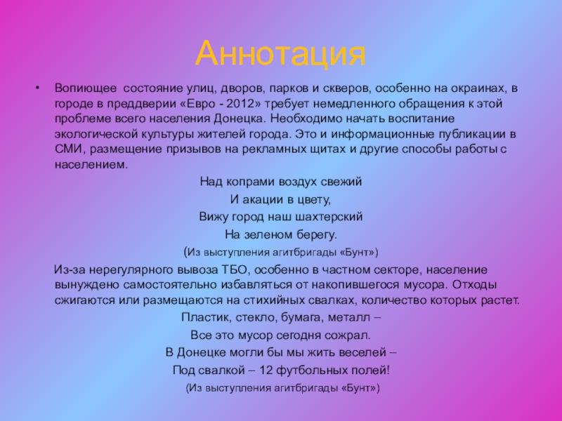 городе в преддверии «Евро - 2012» требует немедленного обращения к этой проблеме всего населения Донецка. Необходимо начать воспитание экологической культуры жителей города. Это и информационные публикации в СМИ, размещение призывов на рекламных щитах и другие способы работы с населением.