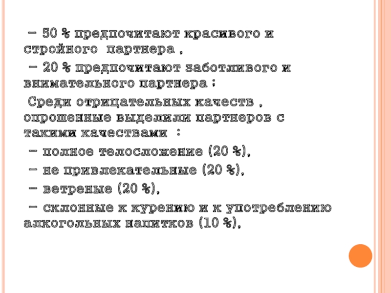 - 50 % предпочитают красивого и стройного партнера , - 20 % предпочитают заботливого и внимательного