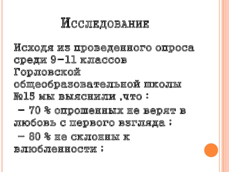 ИсследованиеИсходя из проведенного опроса среди 9-11 классов Горловской общеобразовательной школы №15 мы выяснили ,что : - 70