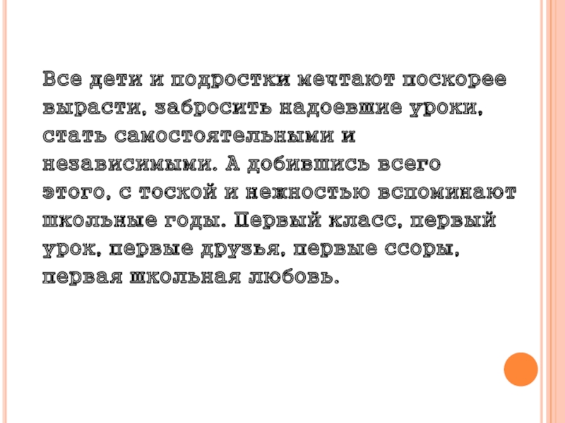 самостоятельными и независимыми. А добившись всего этого, с тоской и нежностью вспоминают школьные годы. Первый класс, первый урок, первые друзья, первые ссоры, первая школьная любовь.