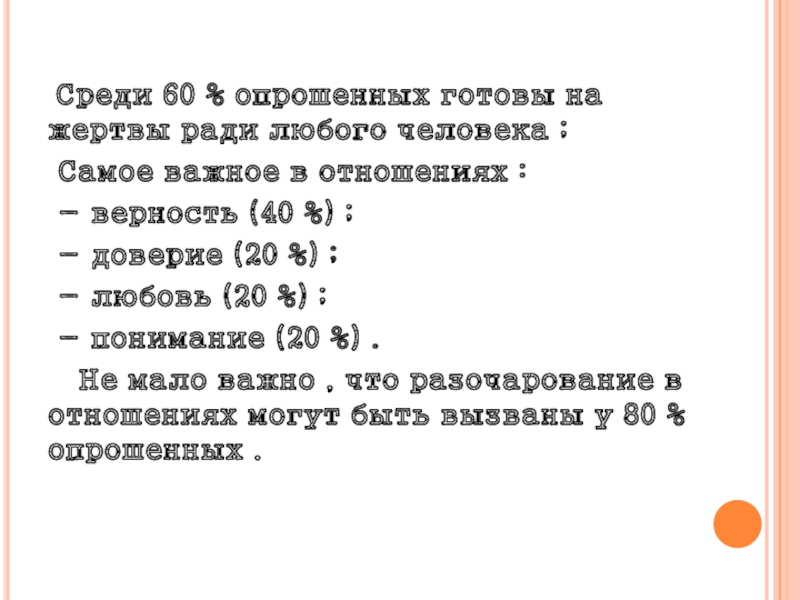 Среди 60 % опрошенных готовы на жертвы ради любого человека ; Самое важное в отношениях :