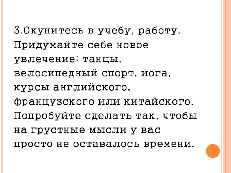 Слайд 143.Окунитесь в учебу, работу. Придумайте себе новое увлечение: танцы, велосипедный спорт,
