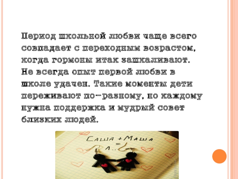 Слайд 4Период школьной любви чаще всего совпадает с переходным возрастом, когда гормоны