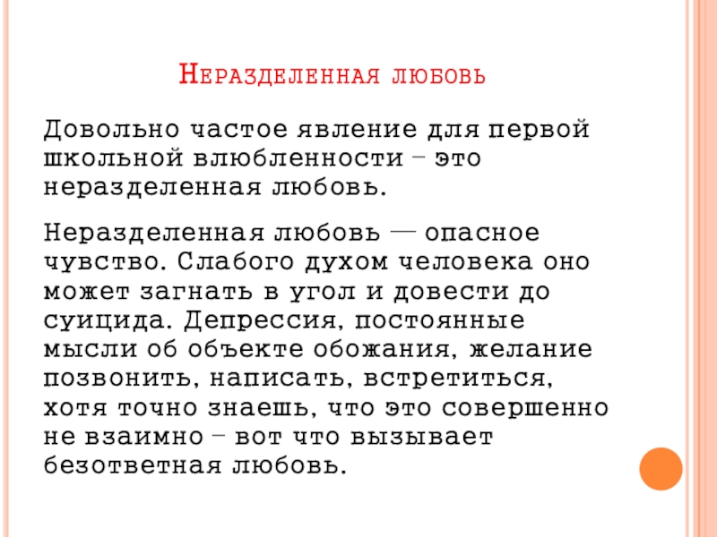 Неразделенная любовьДовольно частое явление для первой школьной влюбленности – это неразделенная любовь.Неразделенная любовь — опасное чувство. Слабого