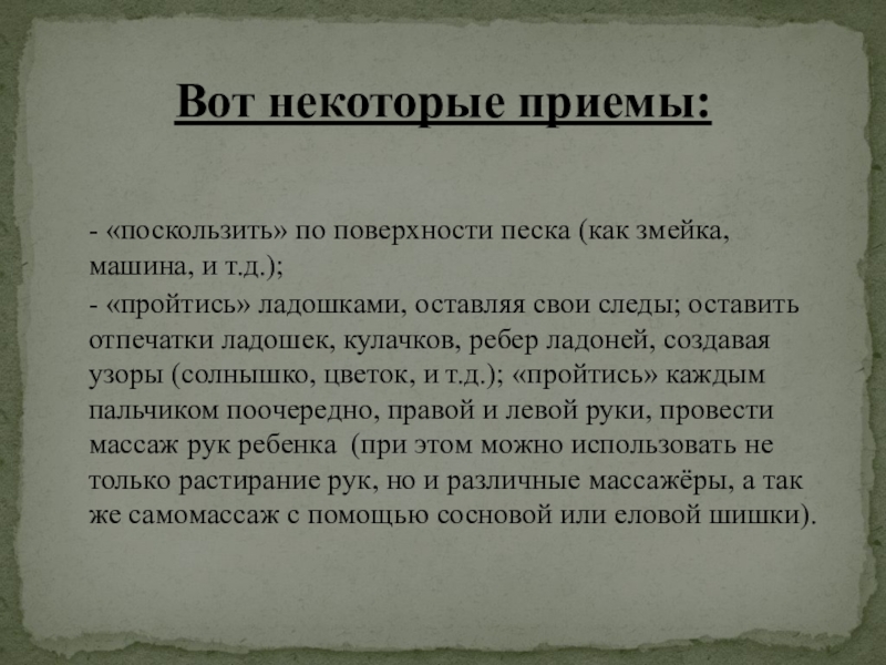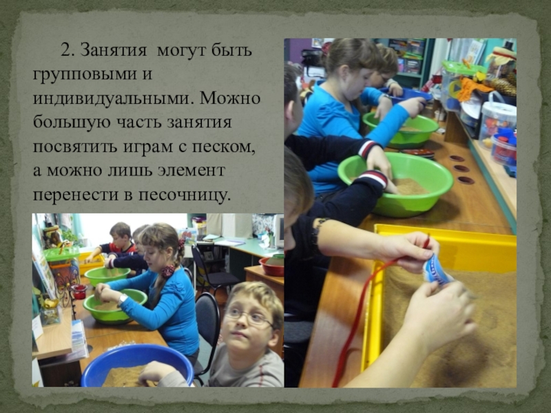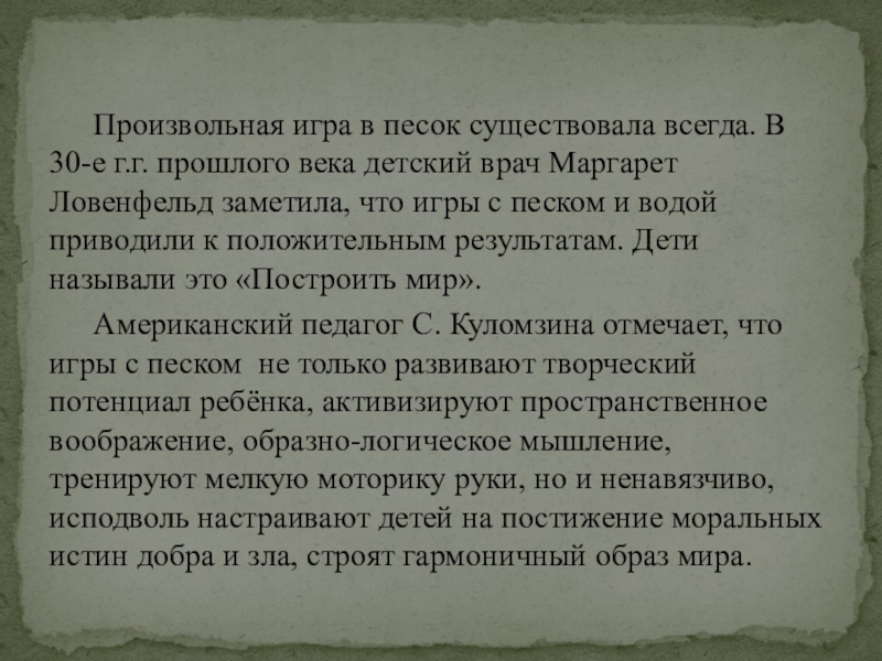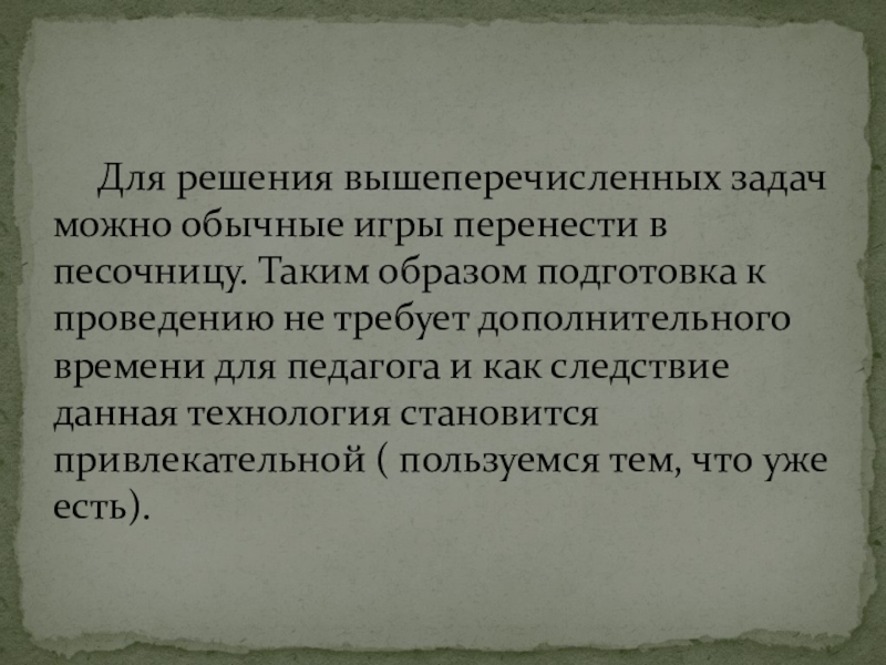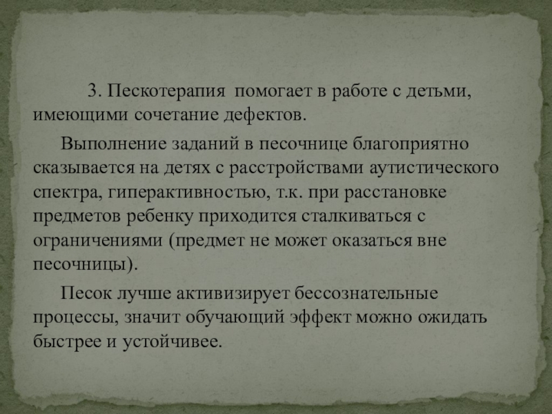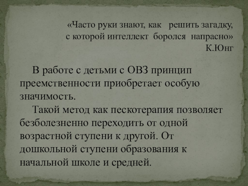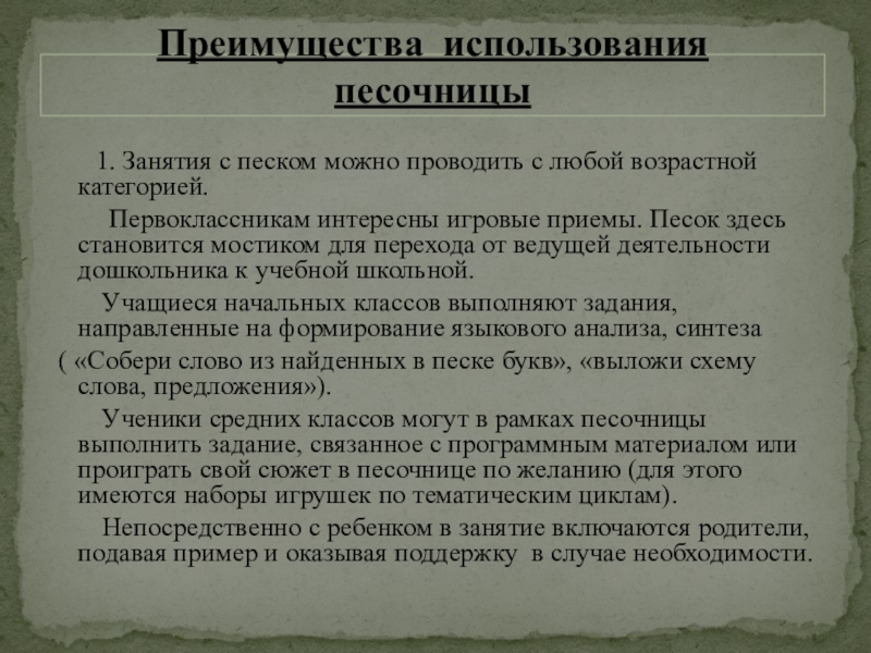 Такой метод как пескотерапия позволяет безболезненно переходить от одной возрастной ступени к другой. От дошкольной ступени образования к начальной школе и средней.