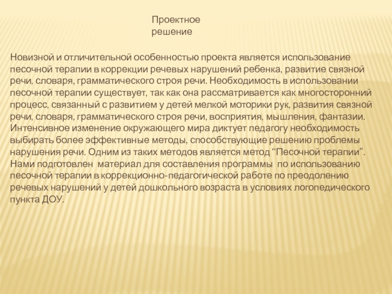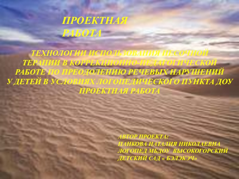 в коррекции речевых нарушений ребенка, развитие связной речи, словаря, грамматического строя речи. Необходимость в использовании песочной терапии существует, так как она рассматривается как многосторонний процесс, связанный с развитием у детей мелкой моторики рук, развития связной речи, словаря, грамматического строя речи, восприятия, мышления, фантазии. Интенсивное изменение окружающего мира диктует педагогу необходимость выбирать более эффективные методы, способствующие решению проблемы нарушения речи. Одним из таких методов является метод “Песочной терапии”. Нами подготовлен материал для составления программы по использованию песочной терапии в коррекционно-педагогической работе по преодолению речевых нарушений у детей дошкольного возраста в условиях логопедического пункта ДОУ.