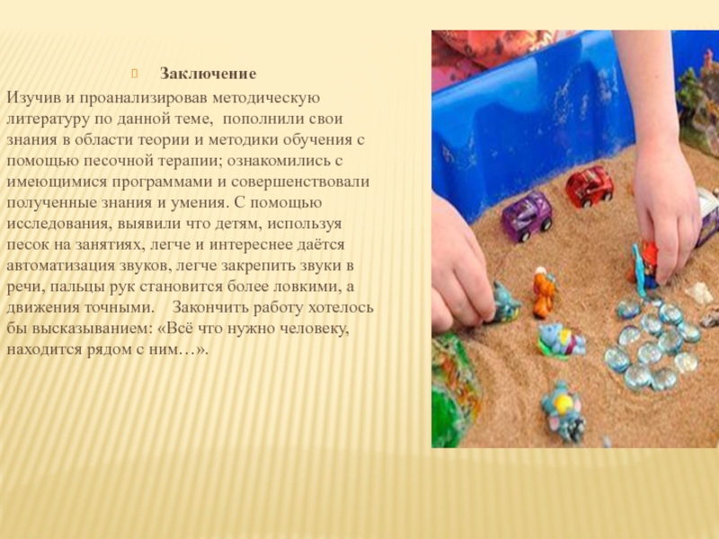 знания в области теории и методики обучения с помощью песочной терапии; ознакомились с имеющимися программами и совершенствовали полученные знания и умения. С помощью исследования, выявили что детям, используя песок на занятиях, легче и интереснее даётся автоматизация звуков, легче закрепить звуки в речи, пальцы рук становится более ловкими, а движения точными. Закончить работу хотелось бы высказыванием: «Всё что нужно человеку, находится рядом с ним…».