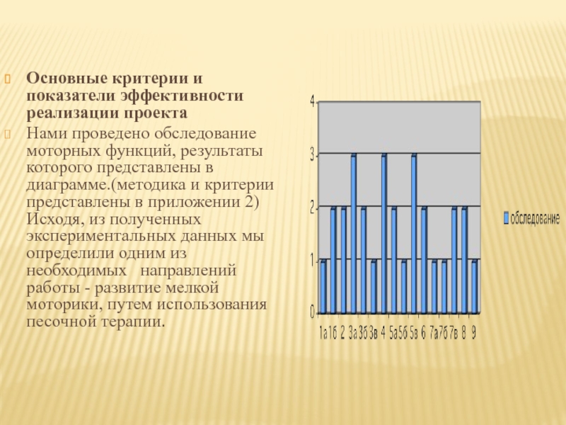 результаты которого представлены в диаграмме.(методика и критерии представлены в приложении 2) Исходя, из полученных экспериментальных данных мы определили одним из необходимых направлений работы - развитие мелкой моторики, путем использования песочной терапии.