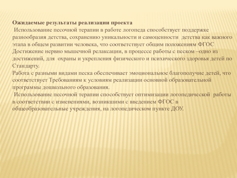 Использование песочной терапии способствует оптимизации логопедической работы в соответствии с изменениями, возникшими с введением ФГОС в общеобразовательные учреждения, на логопедическом пункте ДОУ.