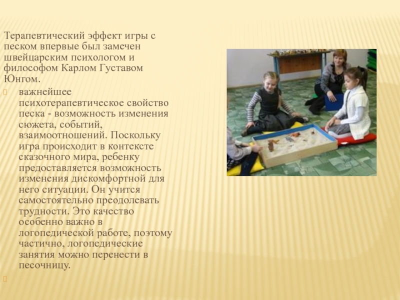 Терапевтический эффект игры с песком впервые был замечен швейцарским психологом и