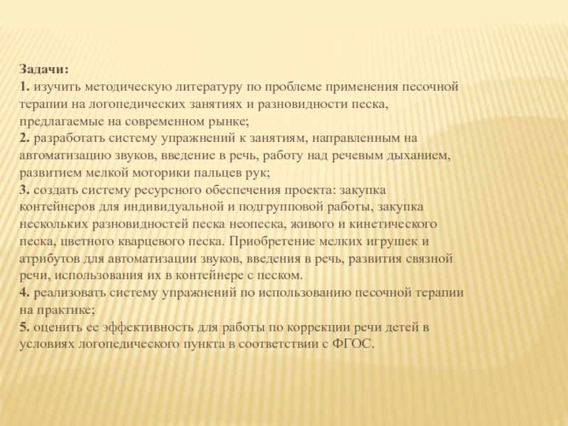 1. изучить методическую литературу по проблеме применения песочной терапии на логопедических