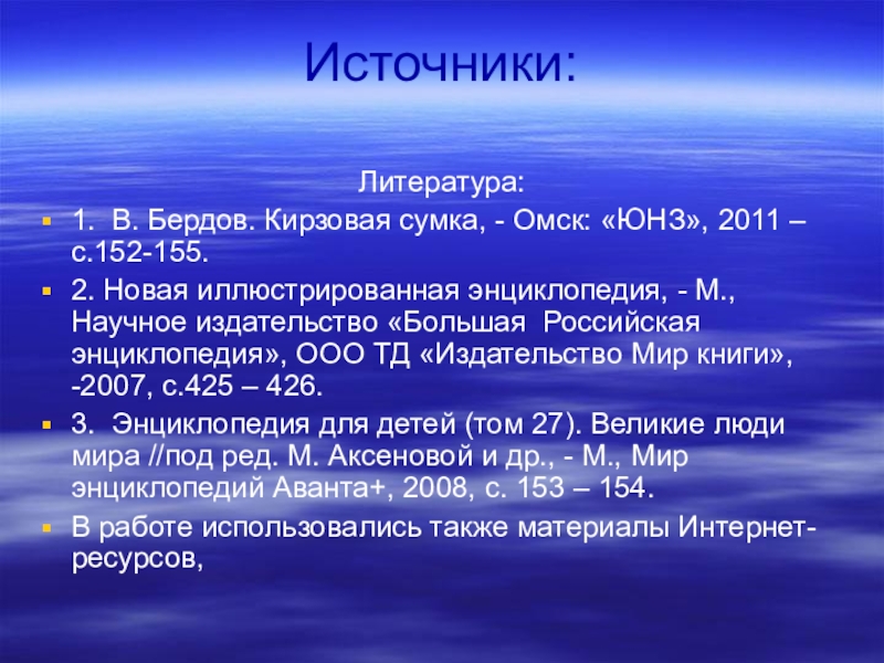 1. В. Бердов. Кирзовая сумка, - Омск: «ЮНЗ», 2011 – с.152-155.