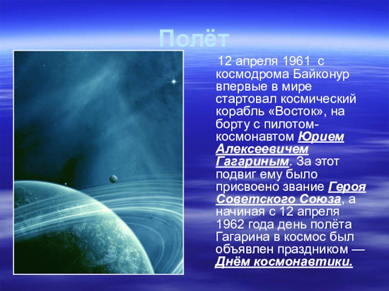 мире стартовал космический корабль «Восток», на борту с пилотом-космонавтом Юрием Алексеевичем Гагариным. За этот подвиг ему было присвоено звание Героя Советского Союза, а начиная с 12 апреля 1962 года день полёта Гагарина в космос был объявлен праздником — Днём космонавтики.