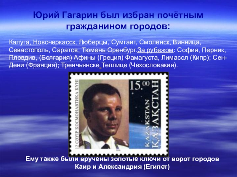 Слайд 19Юрий Гагарин был избран почётным гражданином городов:
