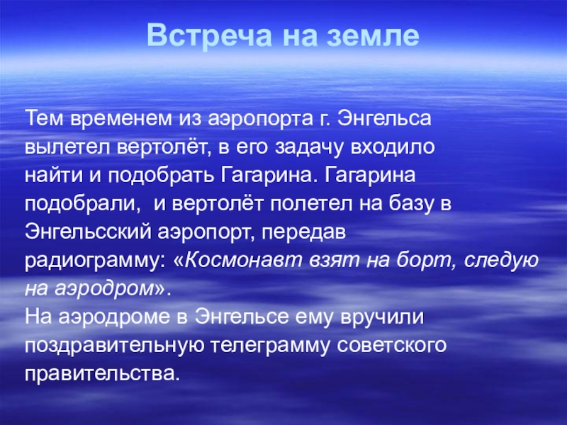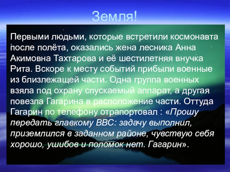 взяла под охрану спускаемый аппарат, а другая повезла Гагарина в расположение части. Оттуда Гагарин по телефону отрапортовал : «Прошу передать главкому ВВС: задачу выполнил, приземлился в заданном районе, чувствую себя хорошо, ушибов и поломок нет. Гагарин».