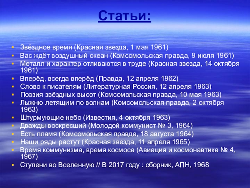 Ю. А. Гагарин. Дорога в космос — М.: Правда, 1961.