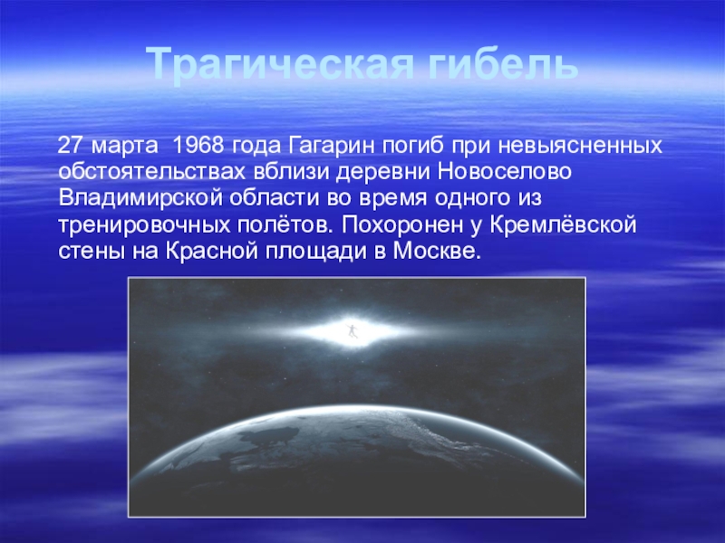 обстоятельствах вблизи деревни Новоселово Владимирской области во время одного из тренировочных полётов. Похоронен у Кремлёвской стены на Красной площади в Москве.