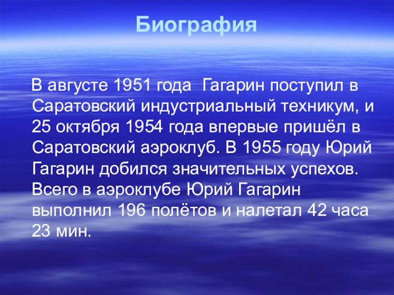 техникум, и 25 октября 1954 года впервые пришёл в Саратовский аэроклуб. В 1955 году Юрий Гагарин добился значительных успехов. Всего в аэроклубе Юрий Гагарин выполнил 196 полётов и налетал 42 часа 23 мин.