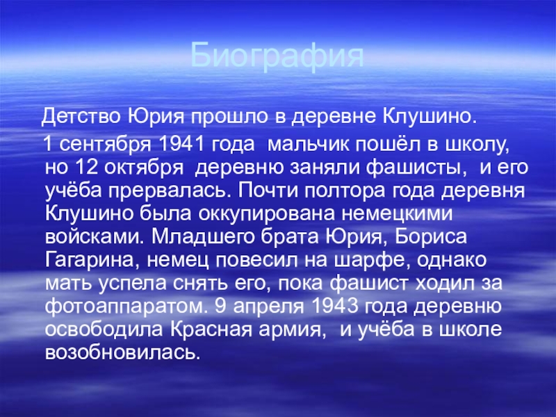 сентября 1941 года мальчик пошёл в школу, но 12 октября деревню заняли фашисты, и его учёба прервалась. Почти полтора года деревня Клушино была оккупирована немецкими войсками. Младшего брата Юрия, Бориса Гагарина, немец повесил на шарфе, однако мать успела снять его, пока фашист ходил за фотоаппаратом. 9 апреля 1943 года деревню освободила Красная армия, и учёба в школе возобновилась.