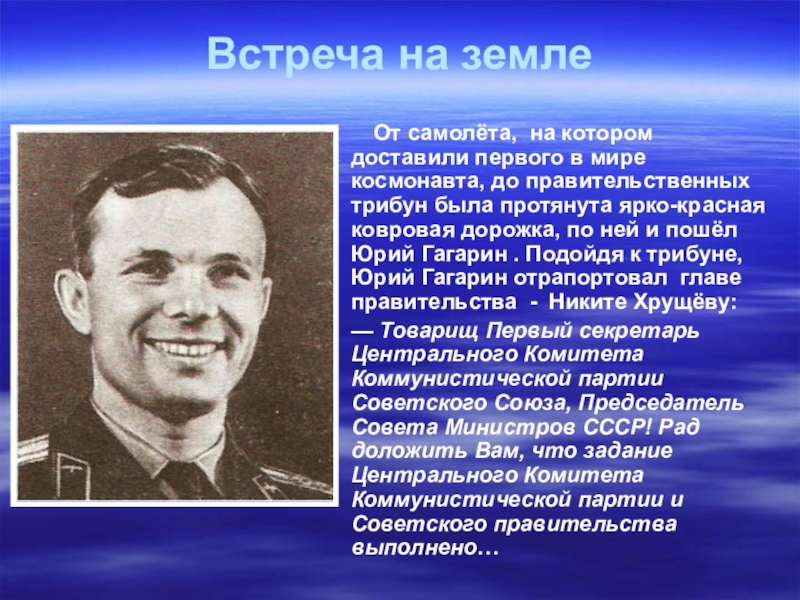 мире космонавта, до правительственных трибун была протянута ярко-красная ковровая дорожка, по ней и пошёл Юрий Гагарин . Подойдя к трибуне, Юрий Гагарин отрапортовал главе правительства - Никите Хрущёву: