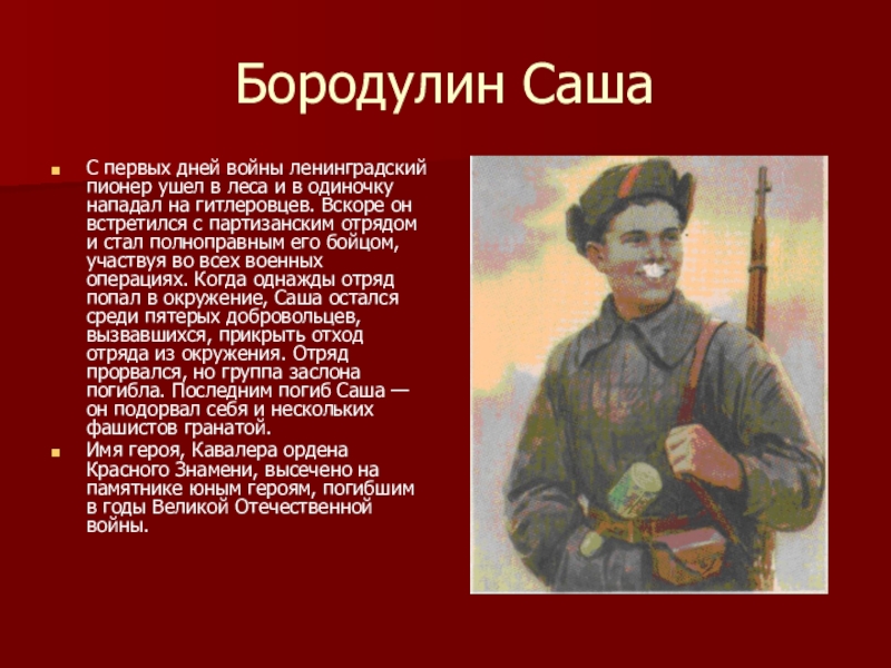 в одиночку нападал на гитлеровцев. Вскоре он встретился с партизанским отрядом и стал полноправным его бойцом, участвуя во всех военных операциях. Когда однажды отряд попал в окружение, Саша остался среди пятерых добровольцев, вызвавшихся, прикрыть отход отряда из окружения. Отряд прорвался, но группа заслона погибла. Последним погиб Саша — он подорвал себя и нескольких фашистов гранатой.