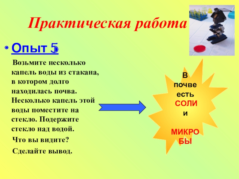 Возьмите промокательную бумагу и насыпьте на нее немного почвы. Прижмите ее плотно к бумаге. Стряхните почву в стакан с водой. Что вы увидите? Что доказывает этот опыт?