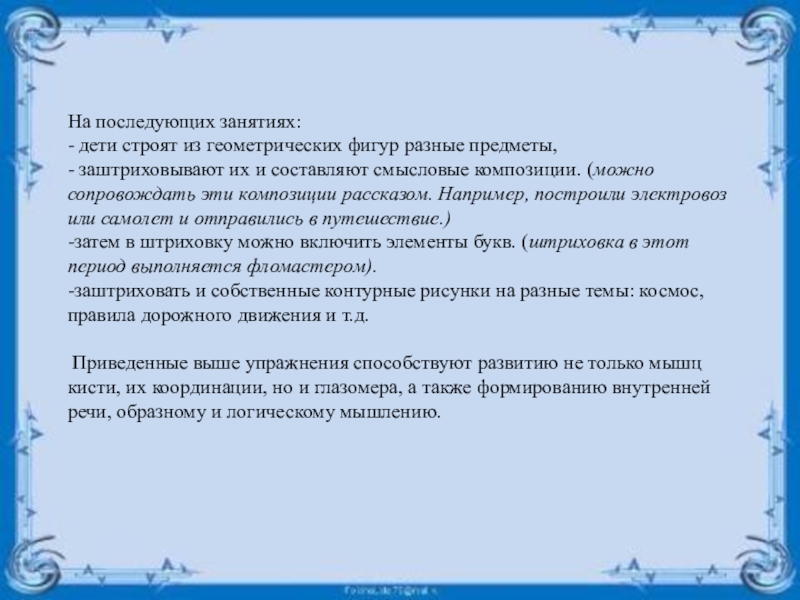 Приведенные выше упражнения способствуют развитию не только мышц кисти, их координации, но и глазомера, а также формированию внутренней речи, образному и логическому мышлению.